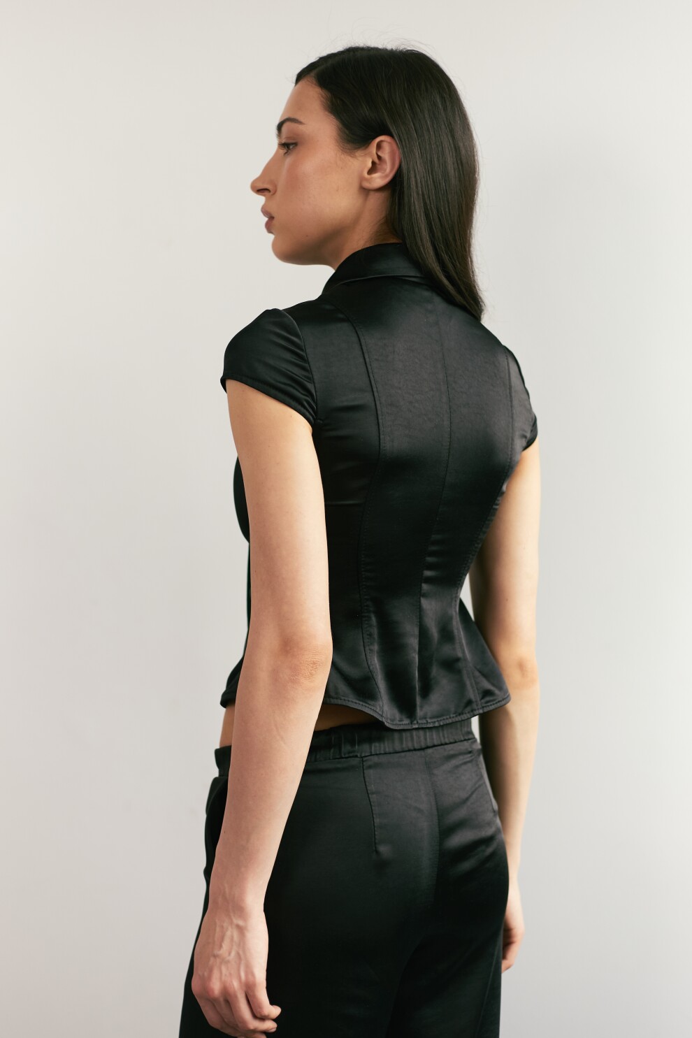 Блуза на молнии. Выполнено из премиального атласа. С легкой баской