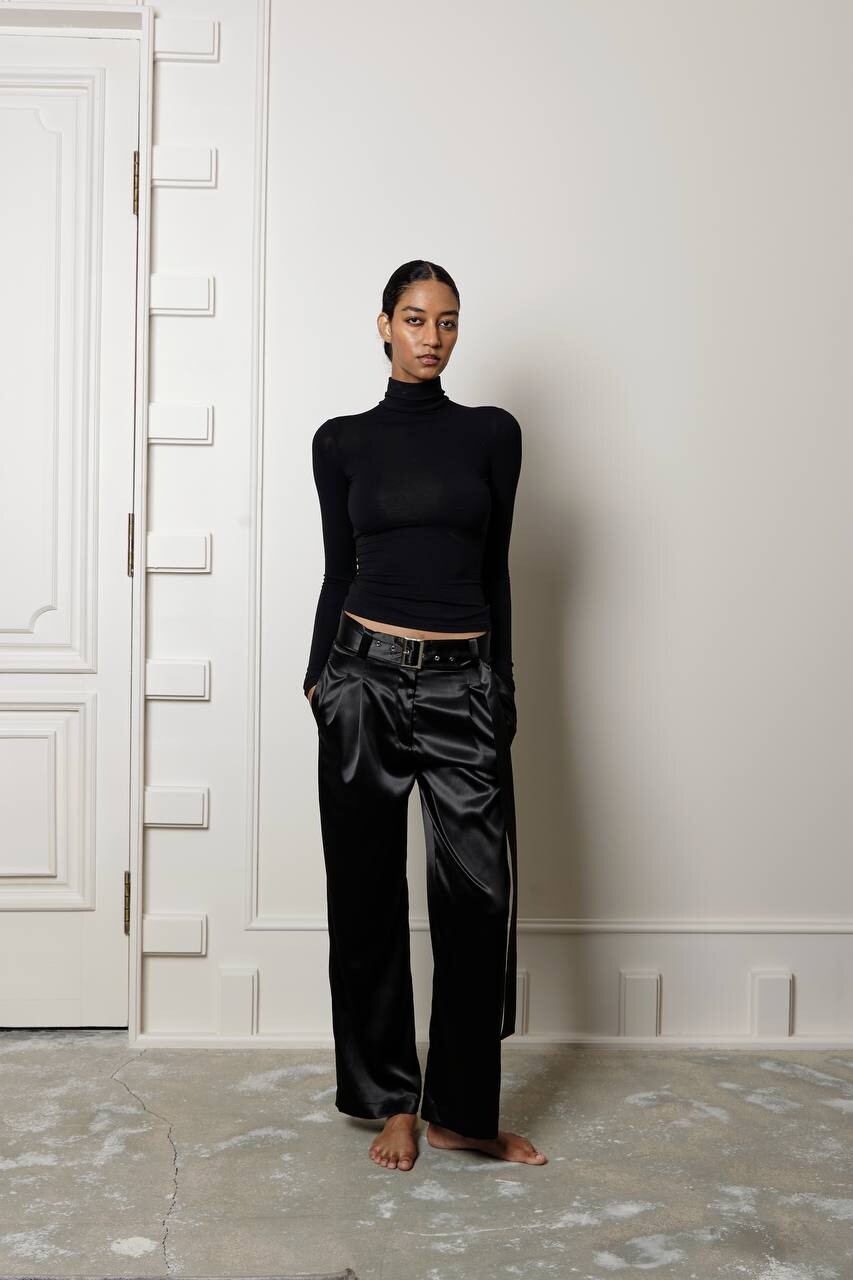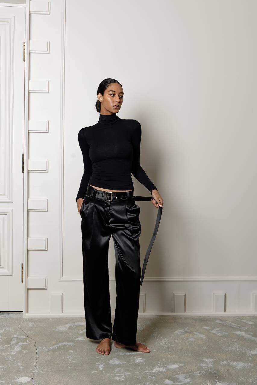 Брюки на низкой посаде, прямого кроя. Доступны в двух вариациях: сатин и костюмная ткань с шерстью