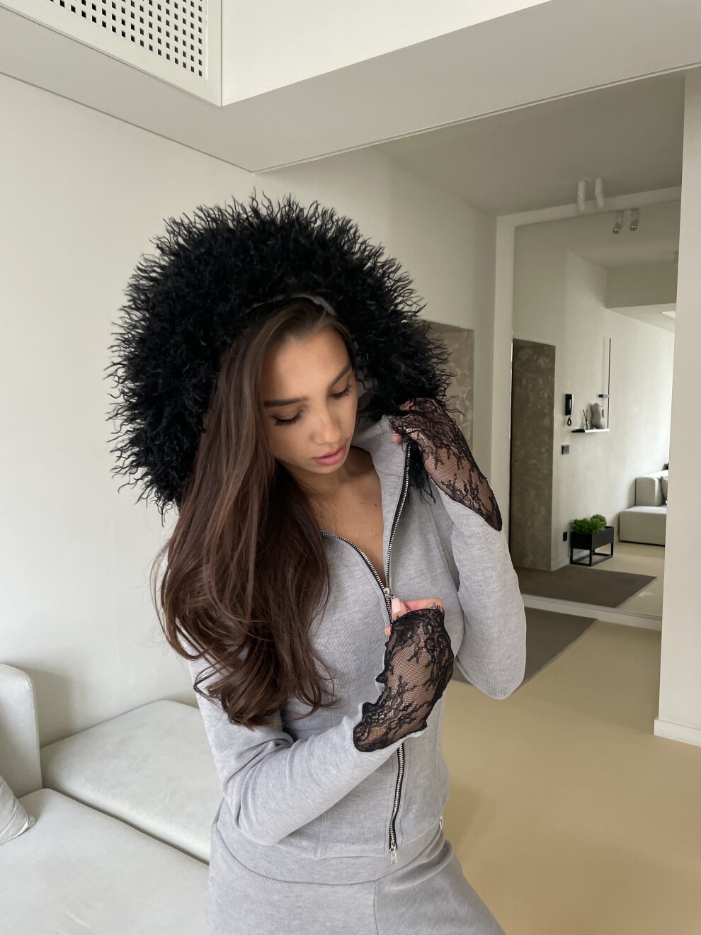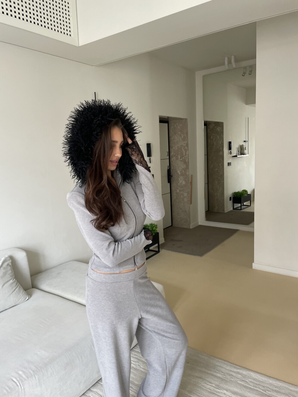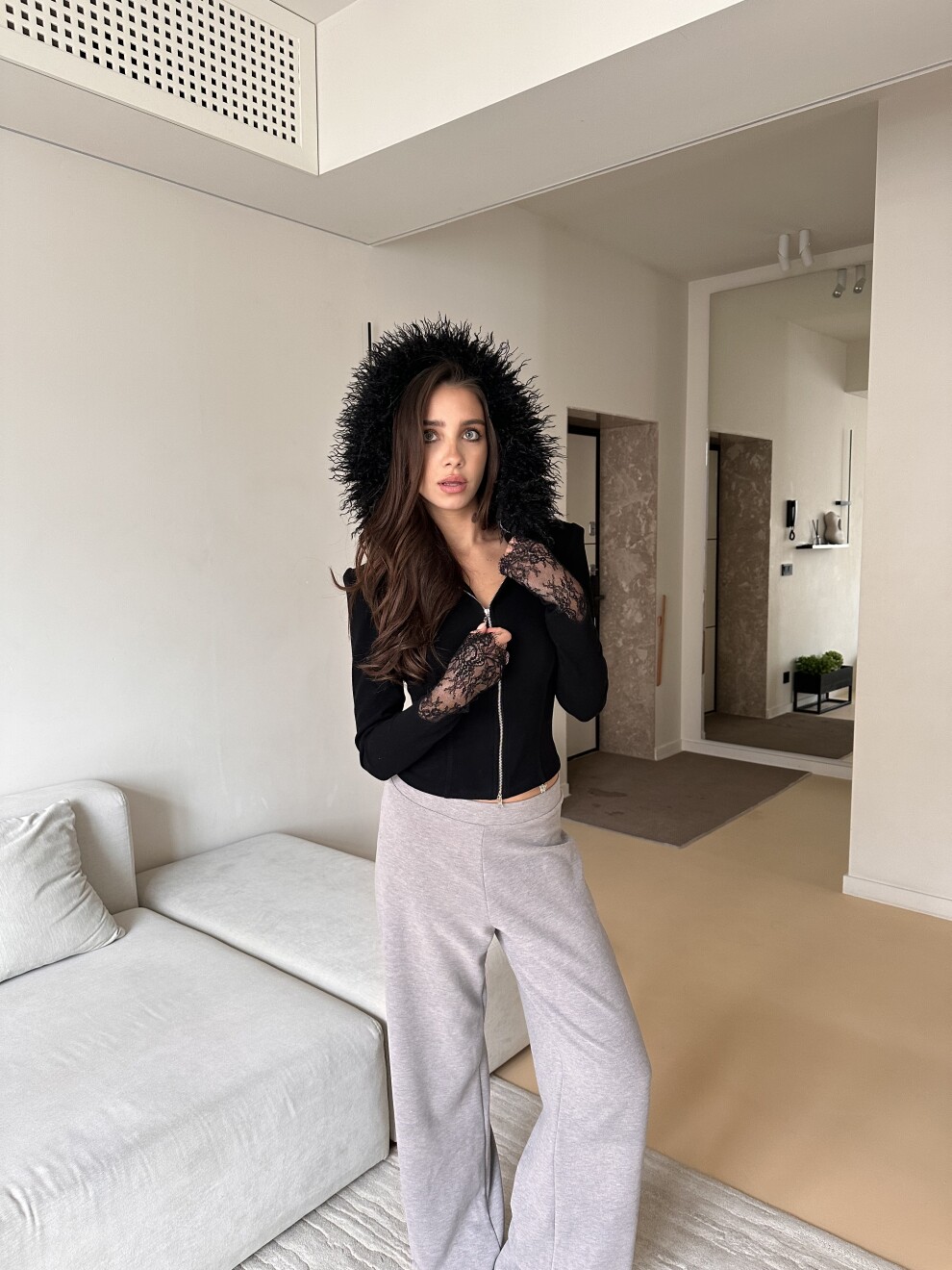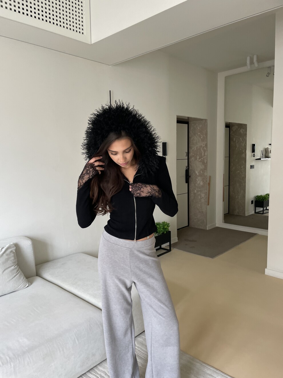 Кофта со сьемной меховой опушкой с акцентными кружевными рукавами.