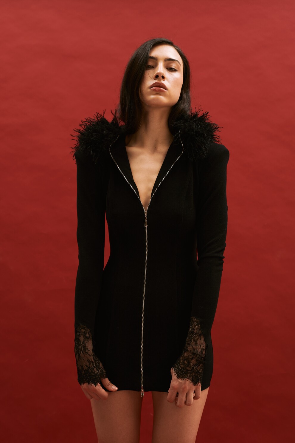 Платье по принципу кофты с опушкой. Длина мини, двусторонний замок. Опушка отстегивается