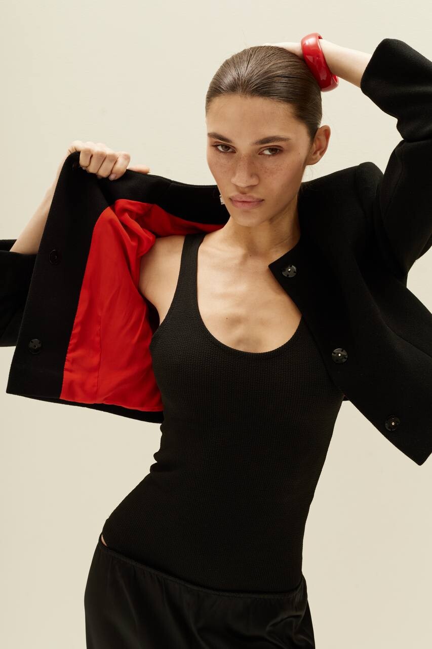 Жакет выполнен из пальтовки, с акцентным красным подкладом.